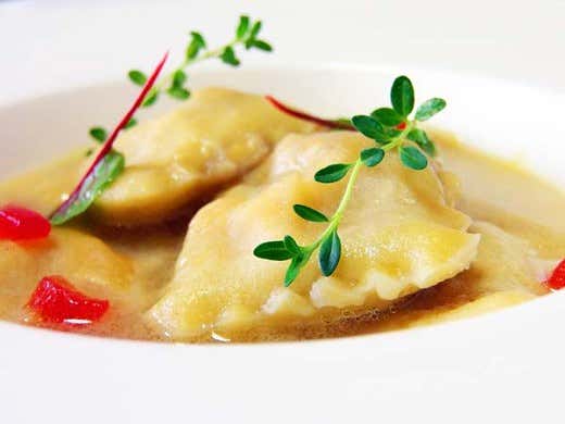 Preparazione: Eviscerare e sfilettare con cura il San Pietro, seguendo con il coltello il corso delle linee dorsali. Separare la testa del resto del corpo, eliminare gli occhi e la bocca e tagliarla a pezzi. Ricavare dei filetti omogenei dal pesce, eliminando anche la pelle. Tenerla da parte. Pulire delicatamente le lische e tagliarle a pezzi. Preparare un fumetto con "i resti" del San Pietro, facendo sfrigolare sul fuoco le lische e la testa, con un battuto di sedano, carota, cipolla e scalogno, aggiungendo le erbe aromatiche. Quando il composto avrà preso un bel colore, quasi "roasted", aggiungere abbondante ghiaccio e farlo sciogliere. Aggiustare di sale e di pepe. Lasciar cuocere almeno 2 ore abbondanti, filtrare e portare a ulteriore riduzione. Abbattere il fumetto e tenerlo in frigo a 3 gradi. Preparare il dashi tenendo a bagno l'alga per farla reidratare. Eliminare la schiumetta che si formerà, portare a bollore l'acqua con l'alga per almeno 10 minuti. Filtrare. Riportare a bollore, aggiungere il katsuobushi, lasciar cuocere altri 10 minuti a fiamma viva. Poi far riposare per il medesimo tempo, e filtrare. Far ridurre il dashi almeno della metà. Unire 2/3 di fumetto di pesce e 1/3 di dashi. Far ridurre ancora il composto, aggiungendo adesso l'acqua di pomodoro ottenuta da uno dei due Cuore di Bue, scottato con acqua bollente, e schiacciato su un colino. (L'acqua va filtrata almeno una volta ma non ha bisogno di zucchero, è dolcissima). Ottenere un estratto di pesce quasi denso e lasciarlo in caldo. Preparare l'impasto dei tortelli, lavorando la farina con le gocce di succo di limone e le uova, aggiungendole poco per volta e realizzando un composto liscio e omogeneo. Farlo riposare circa 20 minuti. Tirare la sfoglia fino a misura 2. "Macinare" a coltello la polpa del San Pietro, irrorarla con olio evo, pepe bianco e limone. Grattugiare il pecorino e tagliuzzare la cipolla rossa marinata con gocce di aceto. Formare la farcia, aiutandosi con un cutter. Disporre la farcia sulla sfoglia, distanziando l'uno dall'altra i tocchetti di pesce e pecorino. Coprire con una nuova sfoglia e formare dei tortelli con un taglia pasta quadrato di medie dimensioni. Scottare un nuovo Cuore di Bue, pelarlo e ricavare dei dadini dalla polpa, eliminando i semi. Cuocere i tortelli in acqua non eccessivamente salata. Scolarli e saltarli qualche istante in padella con gocce di estratto di pesce. Disporre sul fondo di un piatto concavo l'estratto di pesce caldissimo. Aggiungere i tortelli di San Pietro al centro del piatto. Decorare con il concassè di Cuore di Bue. Aggiungere la rumex acetosa e i rametti di timo. Infine disporre sul fondo del brodo qualche goccia di olio evo.