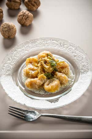 Ingredienti: 200 g zucca, 60 g topinambur, 50 g ricotta, farina tipo 1 o integrale q.b., sale q.b., salvia foglie fresche, 100 g di crescenza con fermenti lattici, burro q.b., noci q.b.