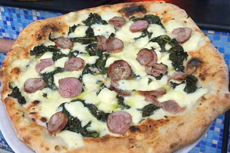 Per la farcitura: una volta preparati i friarielli soffritti in padella con aglio, olio e peperoncino e le salsicce saltandole anch'esse in padella, disporre tutto sul disco e aggiungervi la provola affumicata e l'olio.