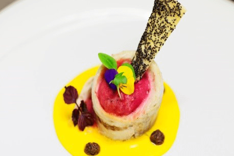 Procedimento: con l’aiuto di un pirottino di alluminio dare al filetto di branzino una forma circolare. Emulsionare le patate con la barbabietola, il latte, il burro e il Parmigiano fino a ottenere un composto soffice e spumoso. In un pentolino scaldare la panna e, non appena inizia a bollire, unire la bustina di zafferano. Far bollire per qualche minuto fino ad ottenere la densità desiderata. Riempire quindi il branzino con la spuma di patate e barbabietole. Infornare a 180°C per 8-10 minuti. Formare, al centro del piatto, uno specchio circolare con la salsa allo zafferano e, una volta cotto il branzino, estrarlo dal pirottino e adagiarlo al centro della salsa. Con il paté di olive creare delle macchie circolari nella salsa e decorare con i germogli.
