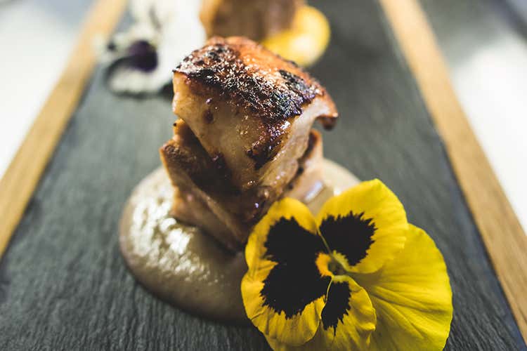 Ingredienti (per 4 persone): 600 g di coppa di maialino da latte, miele di acacia q.b., 2 cipolle rosse di Tropea, 120 g di zucca, 100 g di Taleggio Dop, 300 cl di Végétop Debic, olio evo, brodo vegetale q.b., sale e pepe q.b.