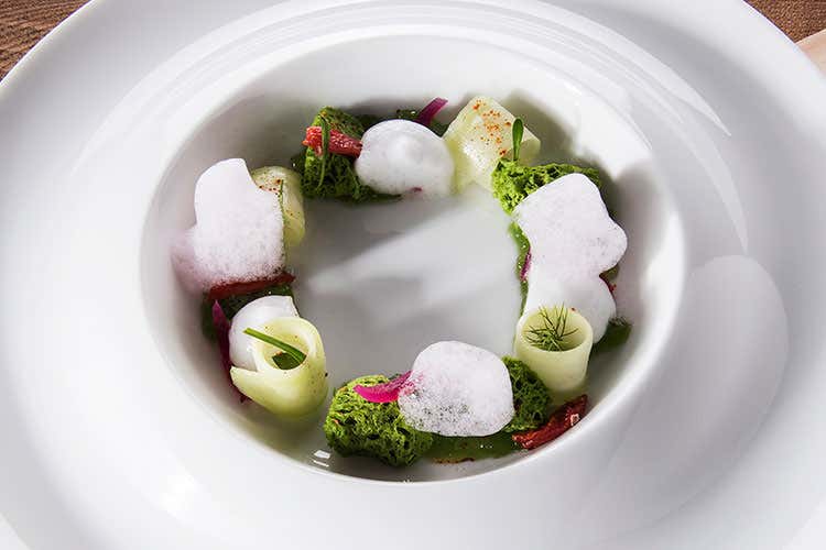 Disporre la gelatina di cetriolo, precedentemente rotta con la frusta, sul fondo del piatto, adagiare la spugna al basilico, i nastri di cetriolo marinati, i petali di pomodorini confit, le foglie di cipolla rossa marinata. Con il sifone, formare delle gocce di spuma di acqua di pomodoro e ultimare con l’aria di cipolla rossa.