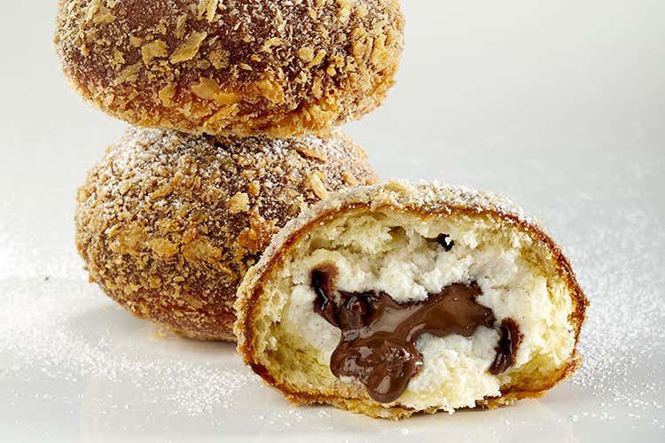 Per la farcitura: setacciare la ricotta con lo zucchero, unire poi le gocce di cioccolato e gli aromi. Miscelare bene e tenere da parte. Con la pasta brioche formare delle palline da 50 g e metterle a lievitare su teglie rivestite con carta da forno fino al raddoppio del volume iniziale. A questo punto infornare a 180°C per circa 15-18 minuti; a fine cottura fare raffreddare bene, quindi con l'aiuto di un coltellino eliminare la parte inferiore di pasta e la mollica. Farcire con il ripieno di ricotta e cioccolato, farcire ancora con la crema gianduja spalmabile, quindi richiudere con il fondo del panino tenuto da parte. Passare prima nella pastella di uova e farina di riso, poi nel pane panko e friggere in olio a 160°C fino a doratura.