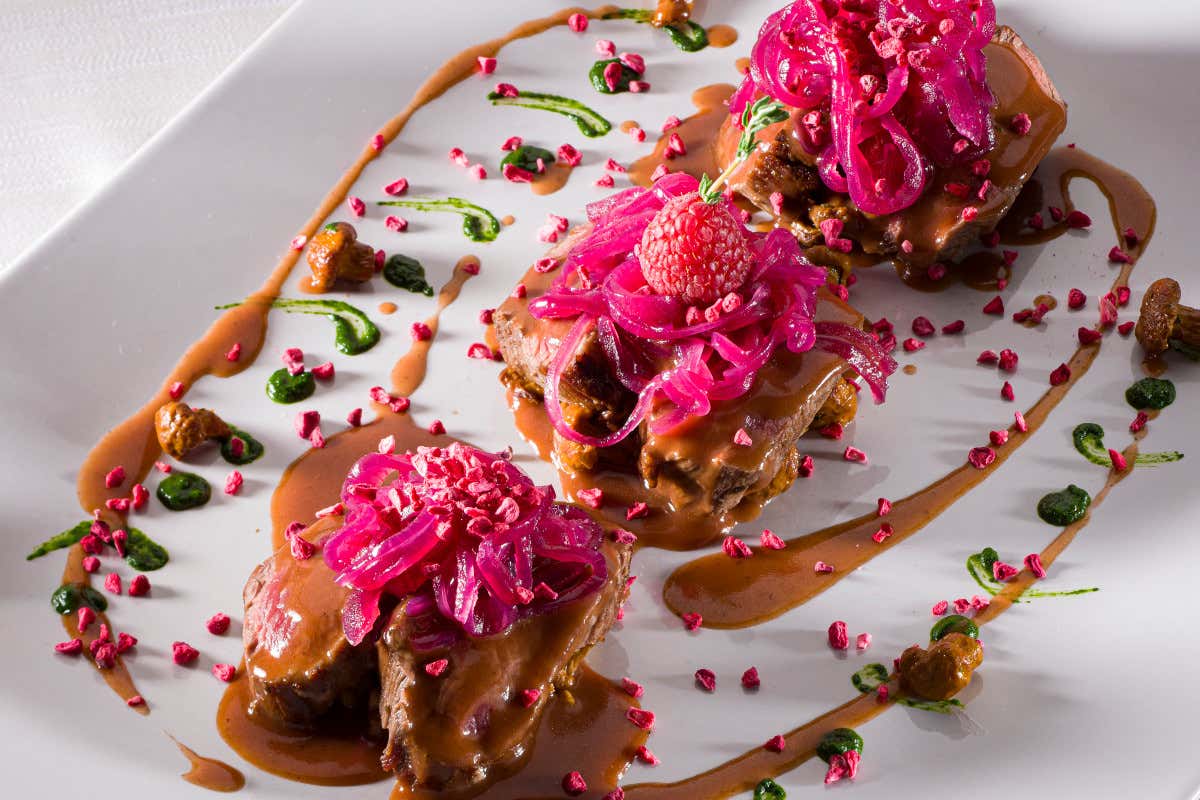 Controfiletto di cervo ai lamponi con finferli e cipolla rossa di tropea