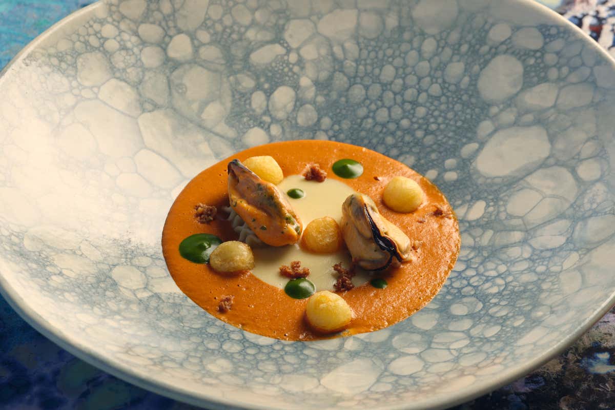 Un piatto che profuma di mare e memoria, “Partenope” è l’incontro audace tra la classica pasta e patate napoletana e l’intensità delle cozze, in una versione raffinata che unisce ingredienti del territorio a lavorazioni contemporanee. La dolcezza delle patate rosse si fonde con la sapidità delle cozze marinate, il tutto esaltato da una salsa marinara ottenuta da pomodorini in acqua di mare e completata da tocchi di clorofilla di prezzemolo e guanciale croccante. Un equilibrio tra rusticità e eleganza, dove ogni componente è pensato per raccontare un pezzo di Napoli.