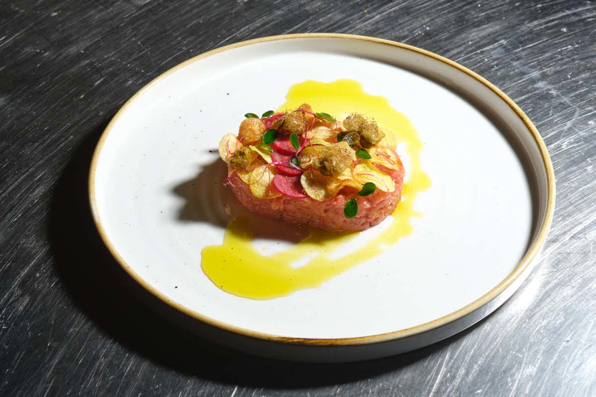 La tartare di manzo firmata dallo chef Elia Lunghi di Evo Bistrot (Perugia) è un omaggio alla tradizione francese reinterpretata con essenzialità e tecnica. Un piatto semplice nella struttura, ma ricco di sfumature grazie a una lavorazione attenta degli ingredienti. La carne, rigorosamente tagliata al coltello per mantenerne intatta la struttura e la freschezza, viene mescolata a un’emulsione cremosa a base di tuorlo d’uovo e olio extravergine. A dare carattere alla preparazione, capperi, scalogno, salsa Worcestershire e un tocco di Tabasco, in equilibrio tra sapidità, acidità e una leggera nota piccante.
