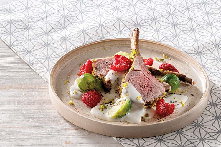 Agnello con pistacchi salsa al Gorgonzola Dop cavoletti e lamponi