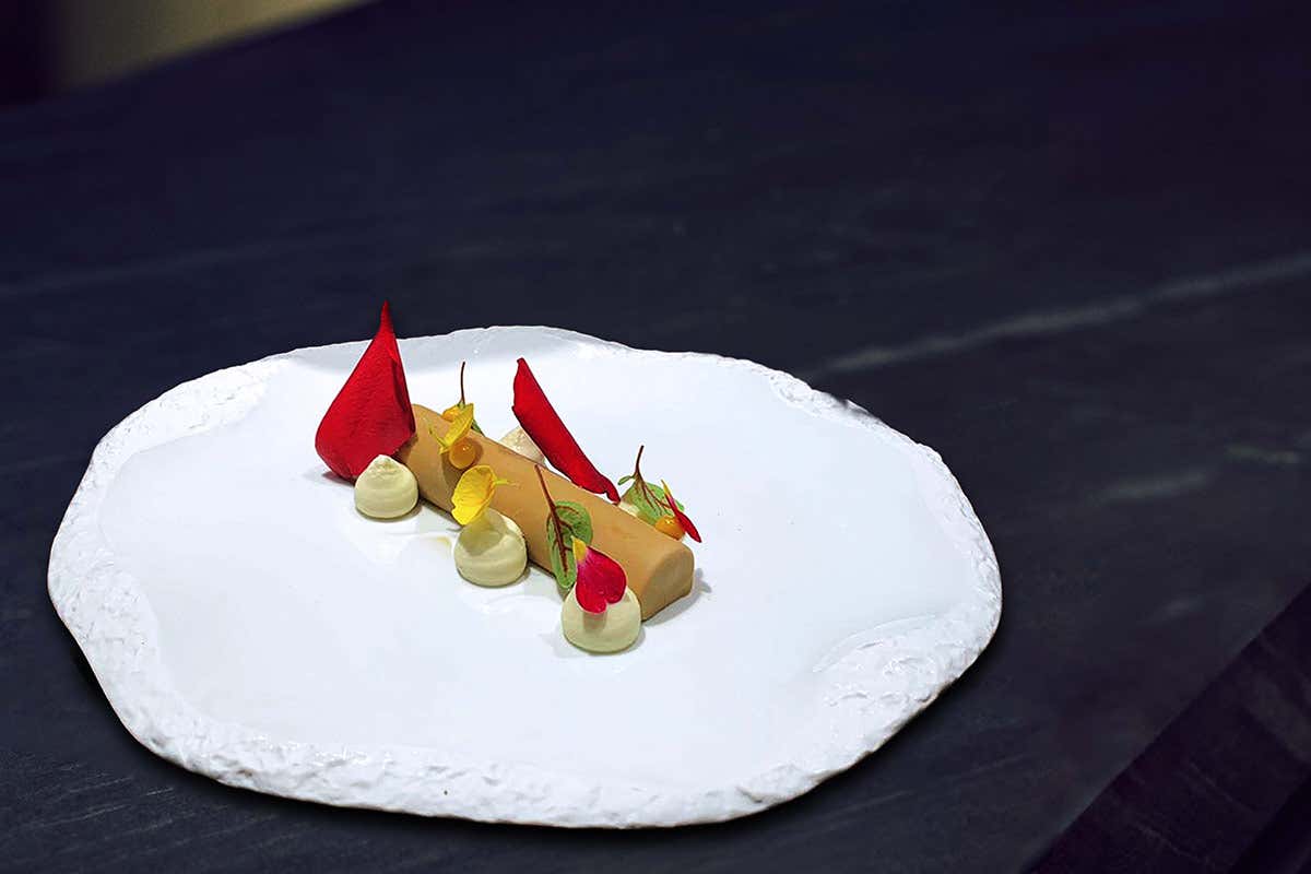 Bavarese alla liquirizia con namelaka al cioccolato bianco, rose rosse e olio extravergine, gel di kumquat alle roseIngredienti e preparazione:Per la bavarese