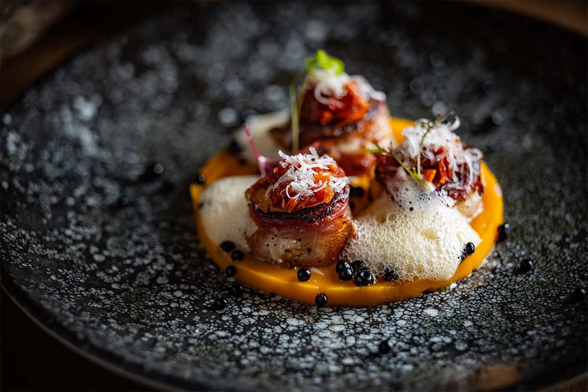 Capesante al guanciale croccante con purea di zucca, finferli e gocce di aceto balsamicoPer le gocce di aceto balsamico:-200 ml di aceto balsamico