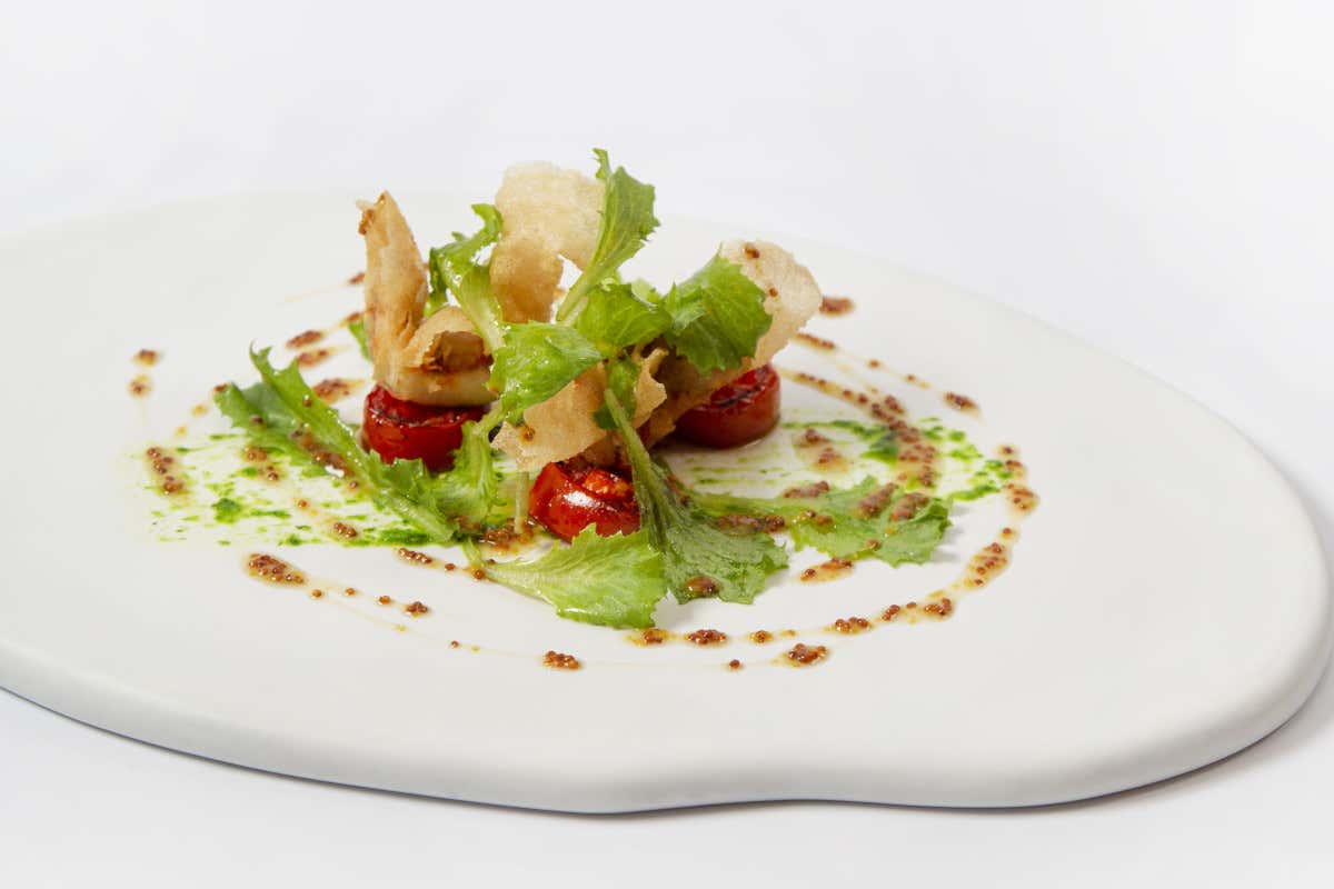 In un piatto piano adagiare al centro un cucchiaio di dressing al lattughino, successivamente aggiungere sopra il pomodoro Camone scottato e la caramella di triglia precedentemente fritta. Guarnire con il dressing al miele e foglie di Baby Iceberg Planet Farms.