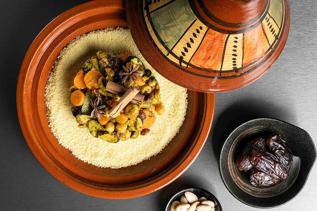 Posizionare il cous cous alla base della tajine e il Contorno Marrakech, ancora surgelato, sopra al cous cous.