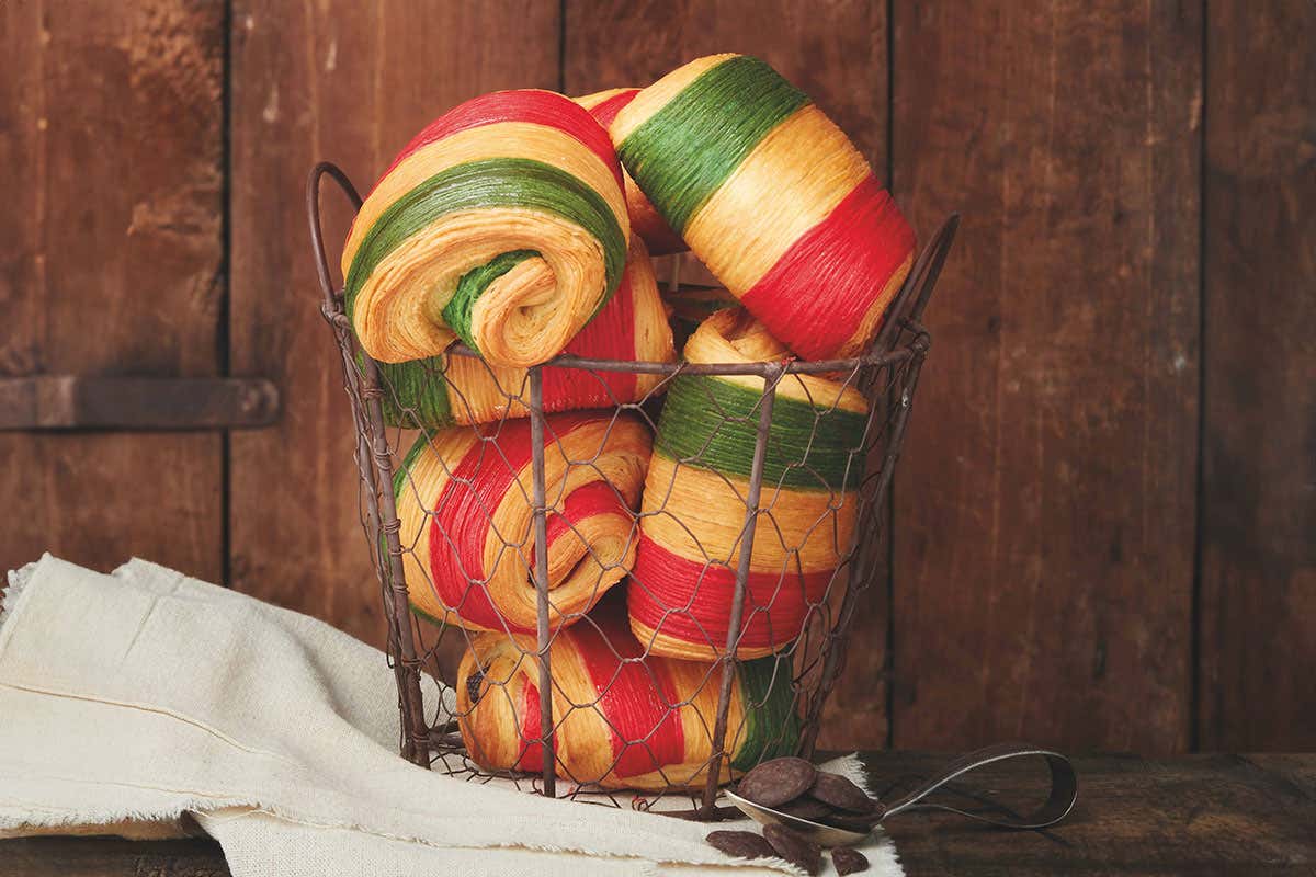 Stendere un impasto bianco a 5 mm. Stendere i tre impasti restanti a 9 mm, quindi tagliare delle strisce di circa 0,5 cm. Appoggiare le strisce sul pastone a 5 mm, nell’ordine verde/bianco/rosso. Stendere il tutto a 4 mm. Tagliare e formare i fagottini.