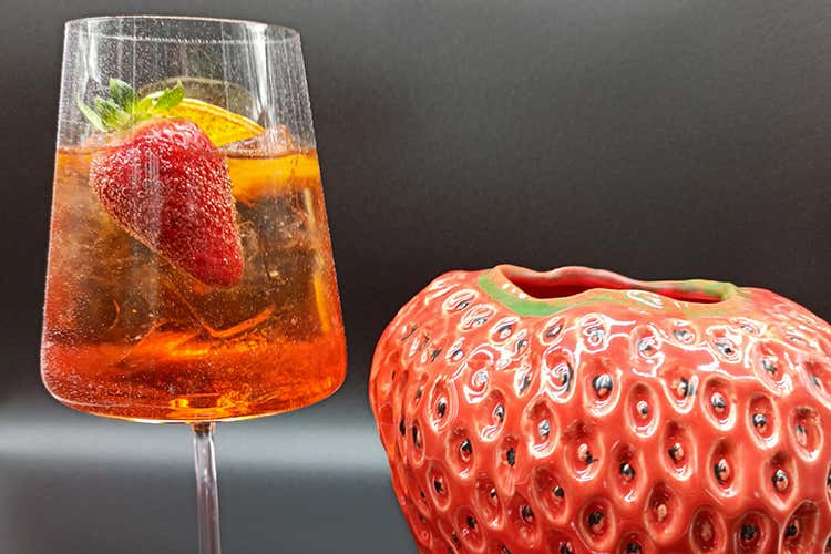 Per lo Strawberry veneziano: in bicchiere da vino mettere 6 cubetti di ghiaccio, 50 ml di Aperol infuso alle fragole, 90 ml di Prosecco e un top di acqua minerale.