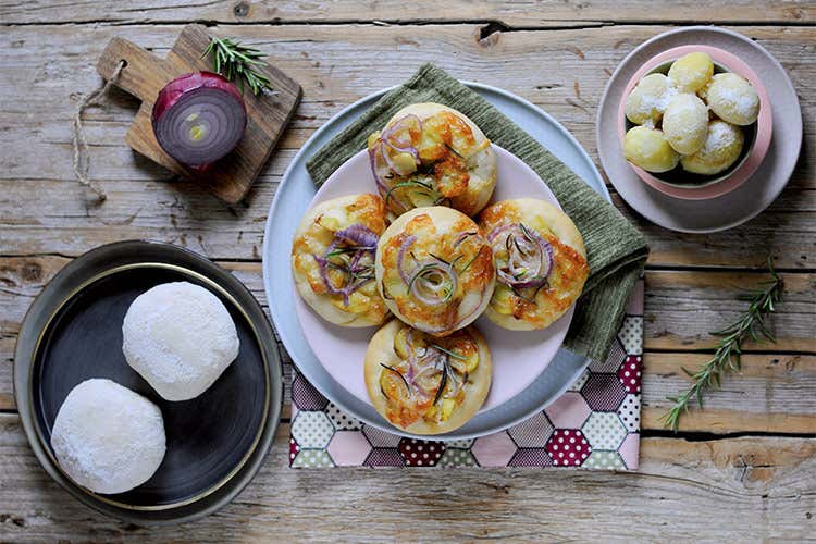 Focaccine con patate novelle, cipolle rosse e scamorza