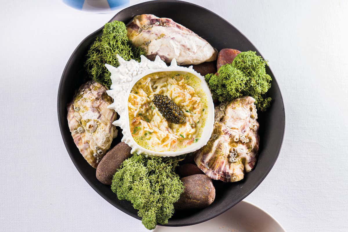Granseola, riduzione di panna acida, bergamotto e caviale.