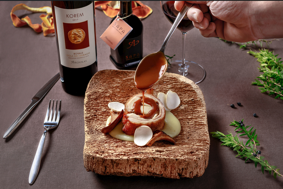 La ricetta del Maialino con crema di patate allo zafferano, cardoncelli e salsa alla Sapa, dello chef Alessandro Taras in abbinamento con il vino Korem Isola dei Nuraghi Igt con base Bovale delle cantine Argiolas . Un piatto elegante che unisce sapori intensi e tradizione. Il maialino, insaporito con sale al mirto, viene arrotolato, cotto a bassa temperatura per mantenerne la morbidezza e infine dorato in forno per una croccantezza irresistibile.