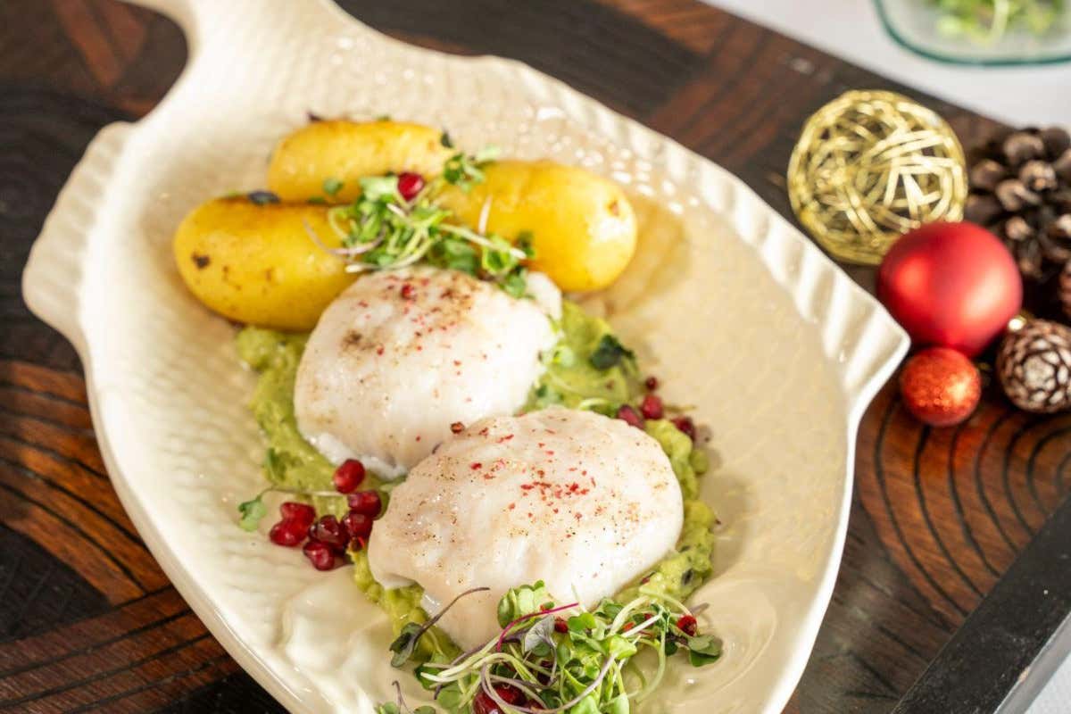 Medaglioni di merluzzo con purea di avocado e patate novelle