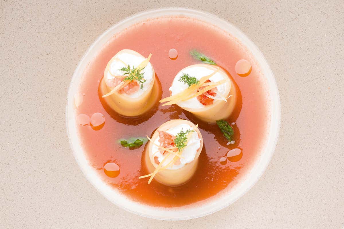 Farcire i paccheri a strati con burrata e gambero. Versare il gazpacho sul fondo del piatto. Successivamente posizionare i paccheri, lezeste di bergamotto e guarnire con la sakura.