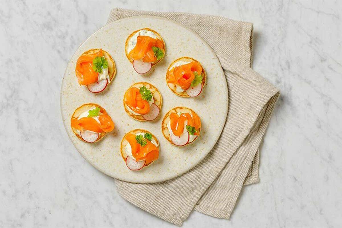 Assemblare i pancake con la crema di rafano, il salmone, una fetta di ravanello e guarnire con prezzemolo fresco.