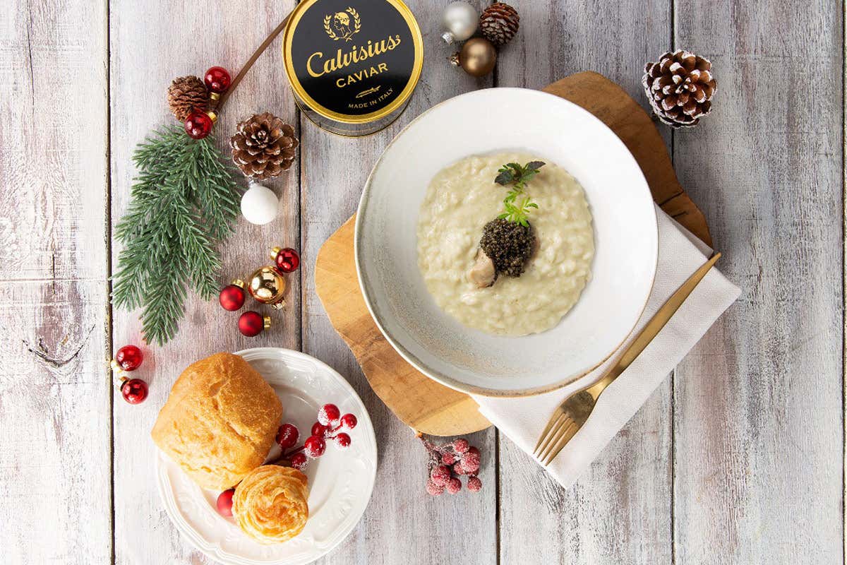 Risotto al burro d’ostrica e CalvisiusProcedimento:Ammorbidire il burro, intanto aprire 8 ostriche e dopo aver filtrato la loro acqua frullare. Una volta ottenuto un impasto morbido aggiungere il burro precedentemente ammorbidito. Mescolare il tutto fino a che risulta omogeneo. Deporre il burro in un contenitore e congelare in freezer.