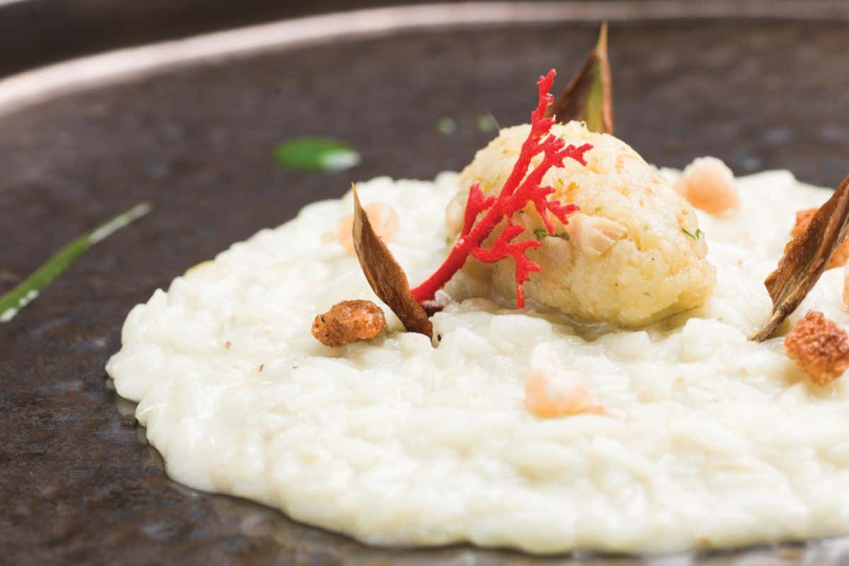 La cremosità del risotto, arricchito da una base di burro e olio Evo, si esalta con il tocco speziato dello zenzero fresco. I cuori di carciofo, cotti delicatamente con burro e brodo vegetale, donano una consistenza morbida e un sapore ricco. La tartare di baccalà, aromatizzata con scorza d'arancia e finocchietto, aggiunge un contrasto fresco e croccante grazie ai pinoli tostati. A completare il piatto, le briciole di pane di Tumminia croccante e i petali di carciofo fritti offrono texture interessanti, mentre lo zenzero candito e le briciole di pane tostato conferiscono un'ulteriore sfumatura di sapore. Un piatto che sorprende per l'equilibrio di ingredienti e sapori.