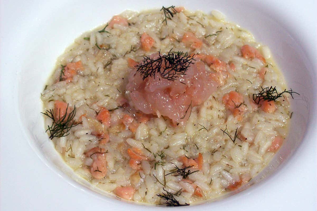 Risotto con salmome affumicato red king, finocchietto selvatico e tartare di gambero rosaIngredienti per 4 persone:Riso carnaroli g 350, salmone affumicato red king g 200,