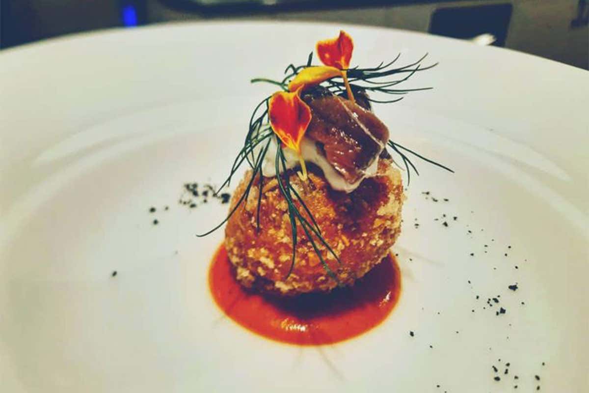 Con le mani formate delle piccole palline con l’impasto Passate le palline nella farina nell’uovo sbattuto e nel pane panko, friggetele in olio di semi ben caldo per circa 3 minuti. Quando le polpette saranno dorate estraetele dall’olio con l’aiuto di un ragno, posatele su della carta assorbente per far perdere l'olio in eccesso. In un piatto piano mettete a specchio la coulis di pomodoro appoggiate il rochè, sopra di esso inserite una puntina di burrata e il filetto di acciuga. Guarnite con fiori eduli e cimette di finocchietto selvatico.