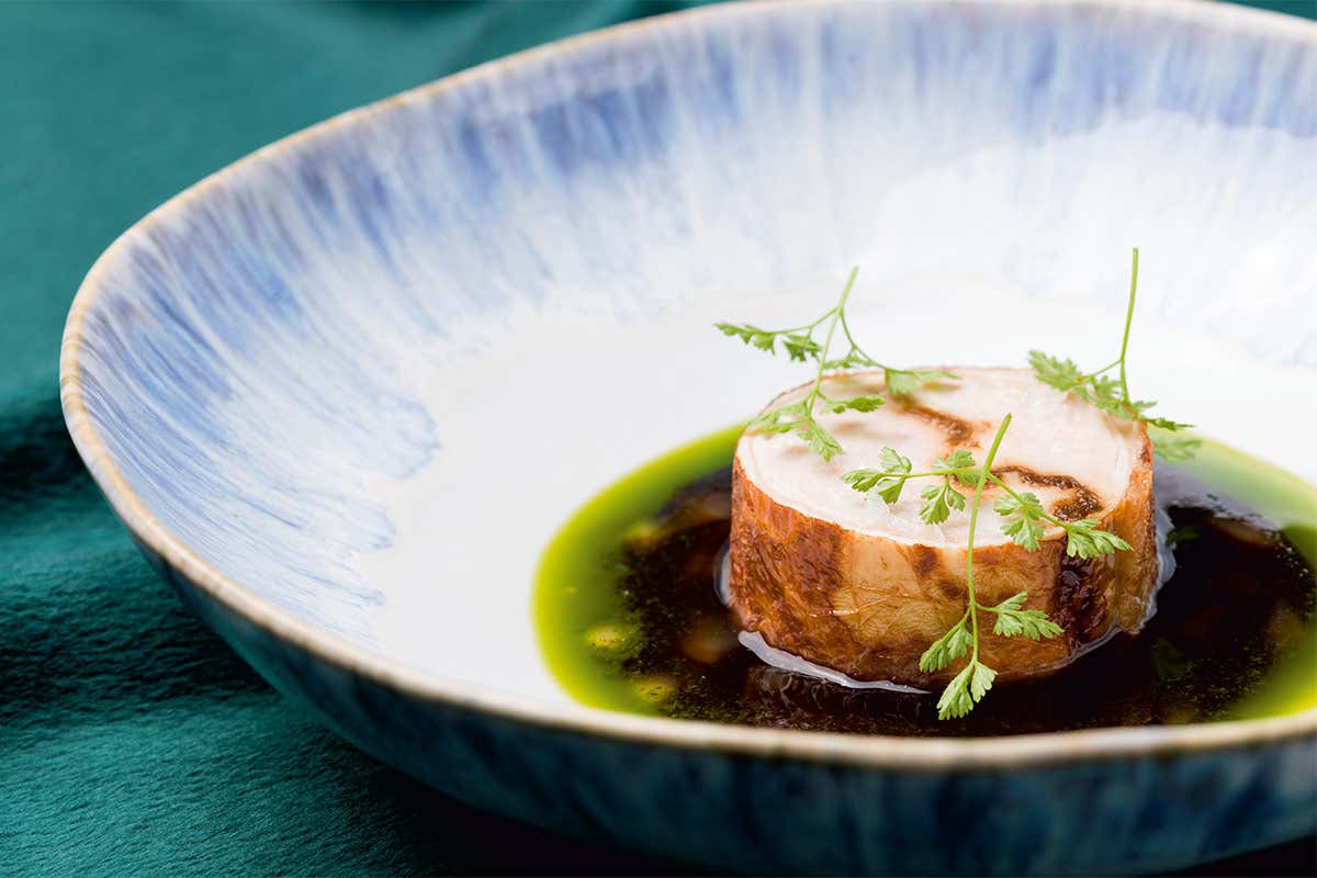 La Roulade di Pollo ai Fichi alla Contadina è un piatto che unisce tradizione e innovazione in un'esperienza culinaria raffinata. La ricchezza del pollo, avvolto in una pelle croccante e farcito con un ripieno dolce e aromatico di fichi, si sposa perfettamente con una mousseline soffice e delicata. La salsa ai fichi, con la sua dolcezza bilanciata, esalta il gusto del pollo, mentre l'olio al cipollotto aggiunge un tocco erbaceo e fresco.