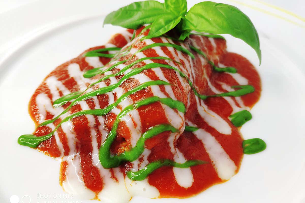 4) Mettere un sottile fondo di ragu’ bello caldo nei piatti di portata ed adagiarvi gli strascinati. Decorare con la salsa di mozzarella e con quella di basilico. Terminare il piatto con un filino di olio extravergine ed una fogliolina di basilico.