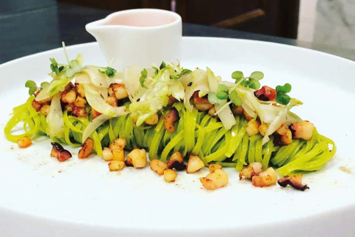 Un primo piatto estivo realizzato dallo chef Andrea Gurzi, che combina sapori di mare e vegetali con un forte richiamo alla Spagna. I tagliolini all'alga spirulina si uniscono al polpo arrostito, puntarelle croccanti e gazpacho di verdure per un'esperienza culinaria fresca e saporita.