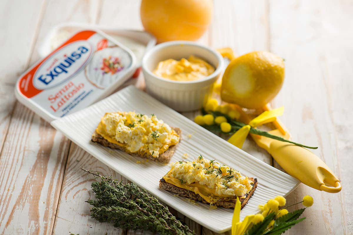 Tartine mimosa PreparazioneCon l’aiuto di un coppapasta rettangolare ricavate 16 tartine dalle fette di pane e tostatele. Preparate le uova sode e lasciatele raffreddare sotto l’acqua corrente. Sbucciatele, sbriciolate i tuorli e versateli in una ciotola insieme al Fresco Cremoso senza Lattosio di Exquisa, il Grana Padano grattugiato, un pizzico di sale e pepe. Mescolate il tutto per amalgamare bene gli ingredienti. Presentazione. Sulla superfice di ogni tartina spalmate un cucchiaio di maionese alla curcuma e adagiate sopra il composto precedentemente ottenuto. Decorate a piacimento con la scorza di limone grattugiata e una spolverata di timo tritato.