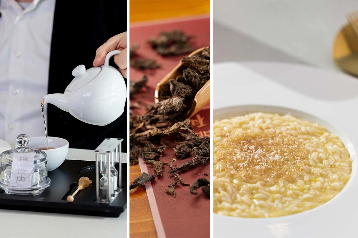 Per contrasto, dove le note dolci dei frutti in cottura del riso e le parti sapide e strutturate dei formaggi impiegati, trovano un perfetto scontro con le terzialità del pu erh e le note fresche delle spezie. La pulizia della bocca provocata dal tè, anche grazie alla temperatura di servizio, lo rendono un perfetto contrasto preparatorio alla bocca per il successivo boccone.