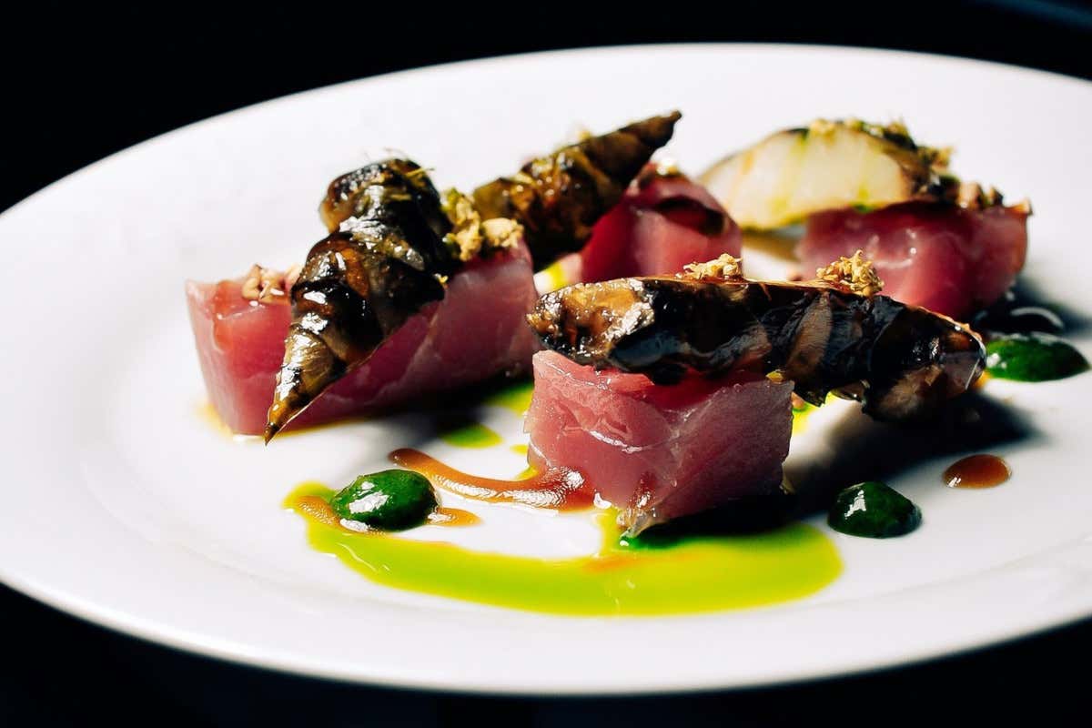 La ricetta dei Cubi di tonno fresco, topinambur arrostito in forno a legna, emulsione di salsa di soia e aceto ai fiori di sambuco, olio allevistico e crema al tarassaco dello chef Marco Apicella del ristorante Al Peschereccio di Vedano Olona (Va), un piatto che esalta i sapori delicati e freschi del tonno e del topinambur, arricchiti da sfumature aromatiche e acidule che completano il piatto. I cubi di tonno fresco, conditi solo all'ultimo per preservare la loro naturale delicatezza, si sposano perfettamente con il topinambur arrostito, che aggiunge una nota terrosa e croccante.