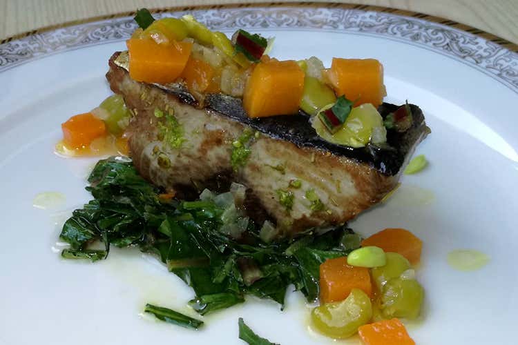 Ingredienti: 1,3 kg di palamita, 80 g di olio extravergine di oliva, 1 spicchio di aglio in camicia, 30 g di porro, 300 g di fave fresche, 250 g di zucca rossa, 1 mazzetto di cicoria, 100 g di aceto, 20 g di zucchero, timo, menta, rosmarino frullato, sale e pepe q.b.