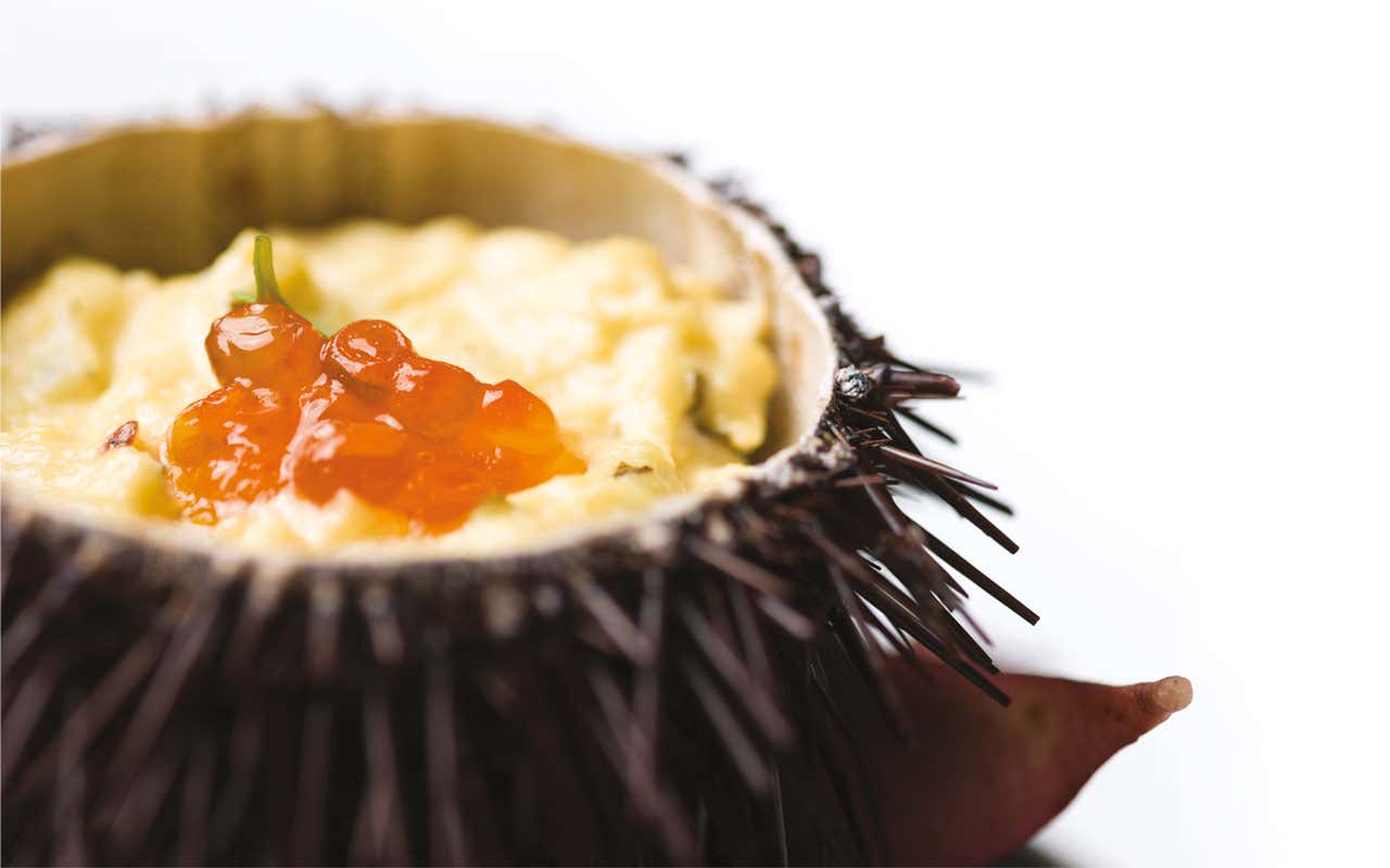 Composizione del piatto: versare nei mezzi gusci di riccio il composto e completare con la burrata al naturale, le uova di salmone e i germogli di senape.