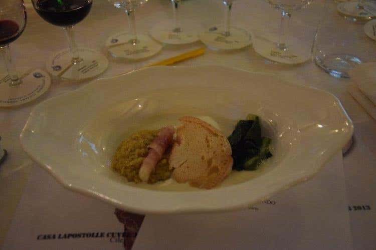 La cena inizia con l’apertura dell’Uovo alle terme al Parmigiano Reggiano su polentina e coste, riportandoci con i piedi ben saldi in terra nazionale, ma subito pronti per aprire le porte al secondo calice internazionale: il Kakheti Saperavi 2013 di Our Wine Anfora, prodotto in Georgia, culla storica del vino, le cui origini risalgono a ben 5.000 anni fa. Vinificato in anfora (14,4% vol.), dal gusto morbido, le cui viti poggiano su terreni fertili e terrosi, questo vino biodinamico si può ben definire spettacolare, grazie a 6 mesi di contatto con i raspi, ed una vinificazione a cappello. Il sapore ti prende, quasi secco sul finale, denotando un gusto di olive nere in salamoia. Il colore violaceo denota un vino strutturato che, come dice Invernizzi, «se per sbaglio ti finisce un po’ sulla camicia, la devi buttare perché le macchie non le togli più».