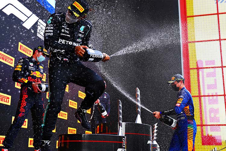 Imola: vincitori del Gran Premio festeggiano con Ferrari TrentodocE così è stato il 18 aprile con il vincitore Max Verstappen, Red Bull Racing Honda, il secondo classificato Lewis Hamilton, Mercedes - Amg Petronas F1 Team, e il terzo Lando Norris, McLaren F1 Team, che hanno festeggiato con