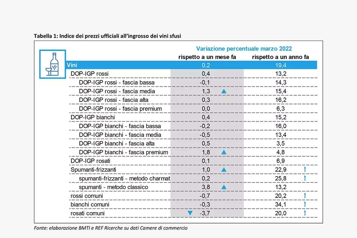 L'indice dei vini sfusi con gli aumenti rispetto al 2021
