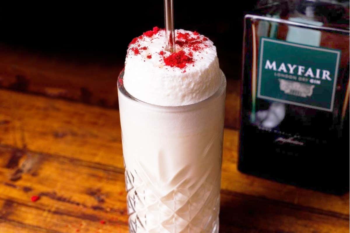 Una rilettura del “Ramos Gin Fizz”, da ottenere mescolando energicamente tutti gli ingredienti, esclusa la panna, fino a ottenere una schiuma soffice. Successivamente, incorporare la panna e il ghiaccio, continuando a mescolare con vigore. Filtrare il composto in un bicchiere da fizz (senza ghiaccio) e completare il riempimento con la soda fresca. Lasciare riposare brevemente e aggiungere gradualmente altra soda per creare un'incantevole nuvola di schiuma che si spande delicatamente lungo il bordo del bicchiere. Infine, decorare con una sottile spolverata di polvere di lampone.