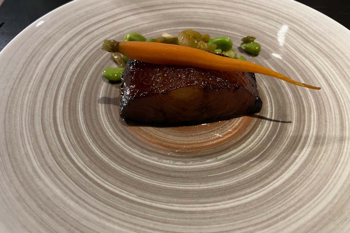 Merluzzo nero d'Alaska al forno marinato con hoisin e champagne servito con edamame e zha cai di Ba Restaurant