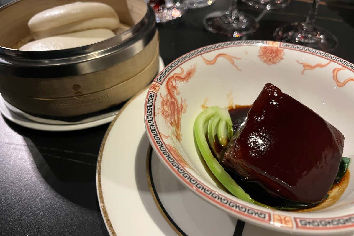 Pancetta di maiale adulo a lunga cottura accompagnata da pane soffice cinese di Ba Restaurant