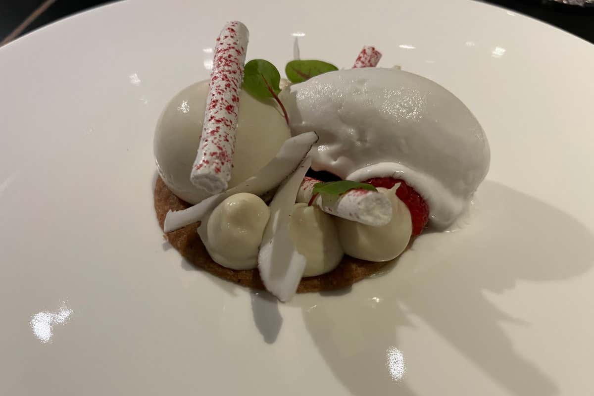 Mousse al litchi, cialda al lampone, cremoso al karkadè, sorbetto al cocco, meringa croccante e salsa al lampone