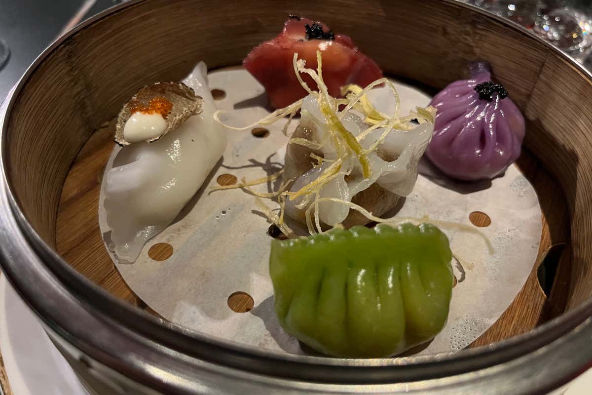 Ravioli con barbabietola rossa e capesante Hokkaido, cavolo viola e astice, spinaci e verdure, black cod e tartufo nero, anatra piccante e ciuffi di porro di Ba Restaurant
