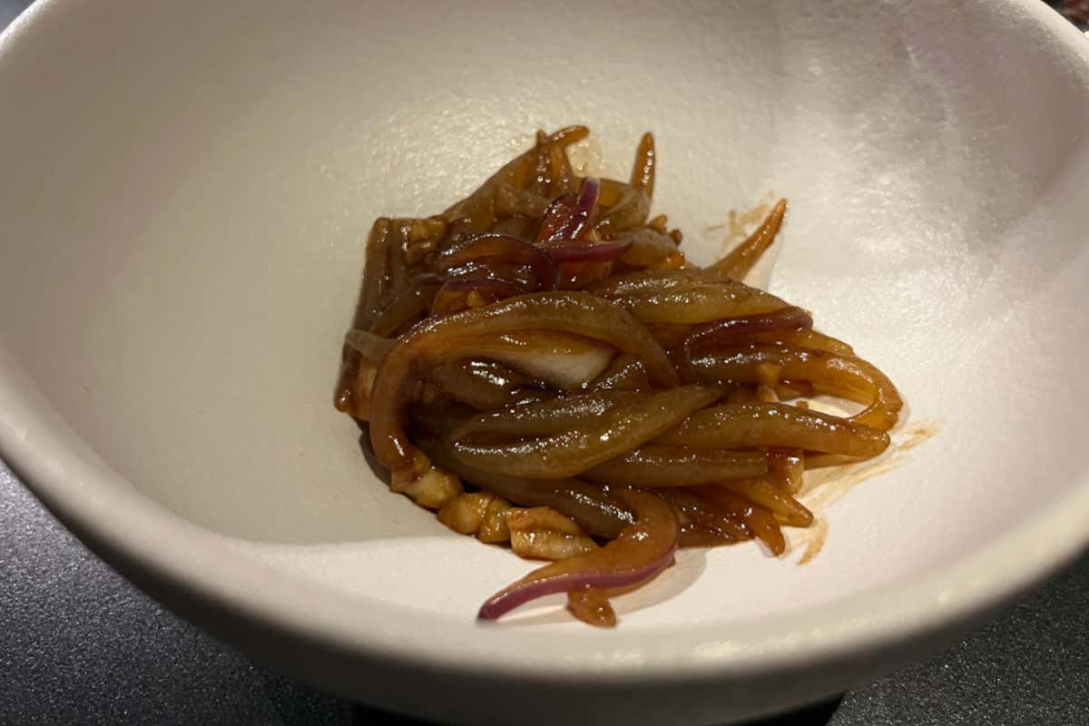 Trofie di riso, lardo di Colonnata, cipolla rossa, gamberi tritati e soia scura di Ba Restaurant