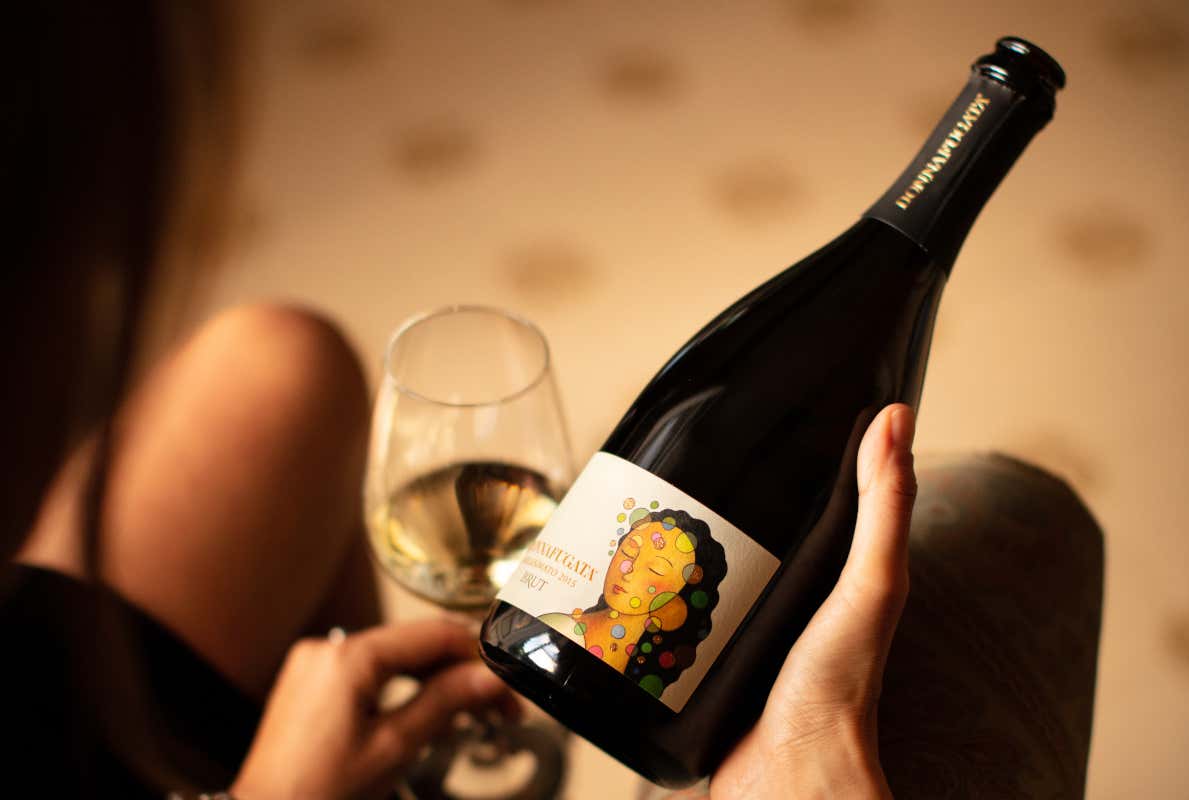 L’etichetta, opera di Stefano Vitale, l’artista che da oltre vent’anni realizza in chiave naif le etichette dei loro vini, rappresenta una donna elegante, il volto illuminato da un leggero sorriso circondato da tante bollicine colorate. I colori sono quelli delle vigne, della terra, del sole di Sicilia con qualche tocco di lamina d’oro, come spicchi di luce che fanno presagire tutta la fine vitalità del contenuto. Piacevole da aperitivo, ottimo abbinato a finger food come, per esempio, bruschette di bottarga e basilico, verdure in tempura o un tagliere di salumi. Accompagna perfettamente primi piatti a base di pesce e crostacei, sfizioso con le capesante scottate e fritture di pesce. Servirlo in calici di media ampiezza, ottimo a 6-8°C.