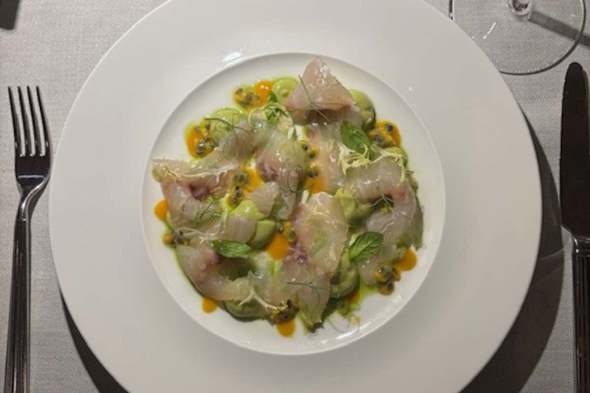Al menu alla Carta del 1919 si uniscono giornalmente altre sette proposte del giorno, mentre le portate che in questo periodo invernale stanno deliziando i palati degli ospiti interni ed esterni sono: il Carpaccio di branzino, rucola, passion fruit e mango; gli Spaghetti all’aglio nero bruciato, gamberi e polvere di cappero; Filetto di orata con zucchine, avvolto da fiori di zucca, patatine alle erbe; Mousse di pere e cioccolato, salsa di mango e mascarpone.