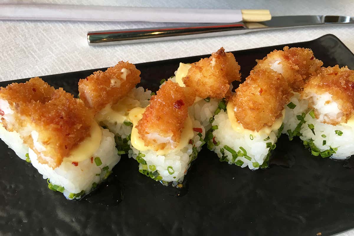 Per la prosecuzione, viene servito un vino meno giovane, ma non troppo maturo ancora, veramente azzeccato per il sushi, a causa della sua complessità gustativa. Ed ecco la carrellata dei sushi (ma ne mancano alcuni): il primo al salmone, poi all’aguglia e melanzane, quindi i classici rolls all’alalunga (tonno bianco) e ai gamberi fritti nel panko. Successivamente anche la pasta ai ricci di mare, al guazzetto di gamberi e alla norma catanese. Quindi, per interrompere il gusto, ecco un sorbetto ai lamponi.