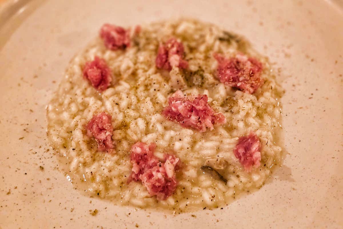Il menù qui cambia ogni mese, sia perché Giuseppe ama cambiare, sia per seguire il corso delle stagioni. Si mangia alla carta, con circa 50 euro per tre piatti. Abbiamo iniziato con le squisite mazzancolle condite con olio e sale e petali di una varietà di rosa a cinque petali molto carnosa che arriva dal giardino, conservata in agrodolce. Succulento e gustoso il ‘bisatto’ (anguilla) servito con fiori di tagete sott'olio e radicchio marinato.