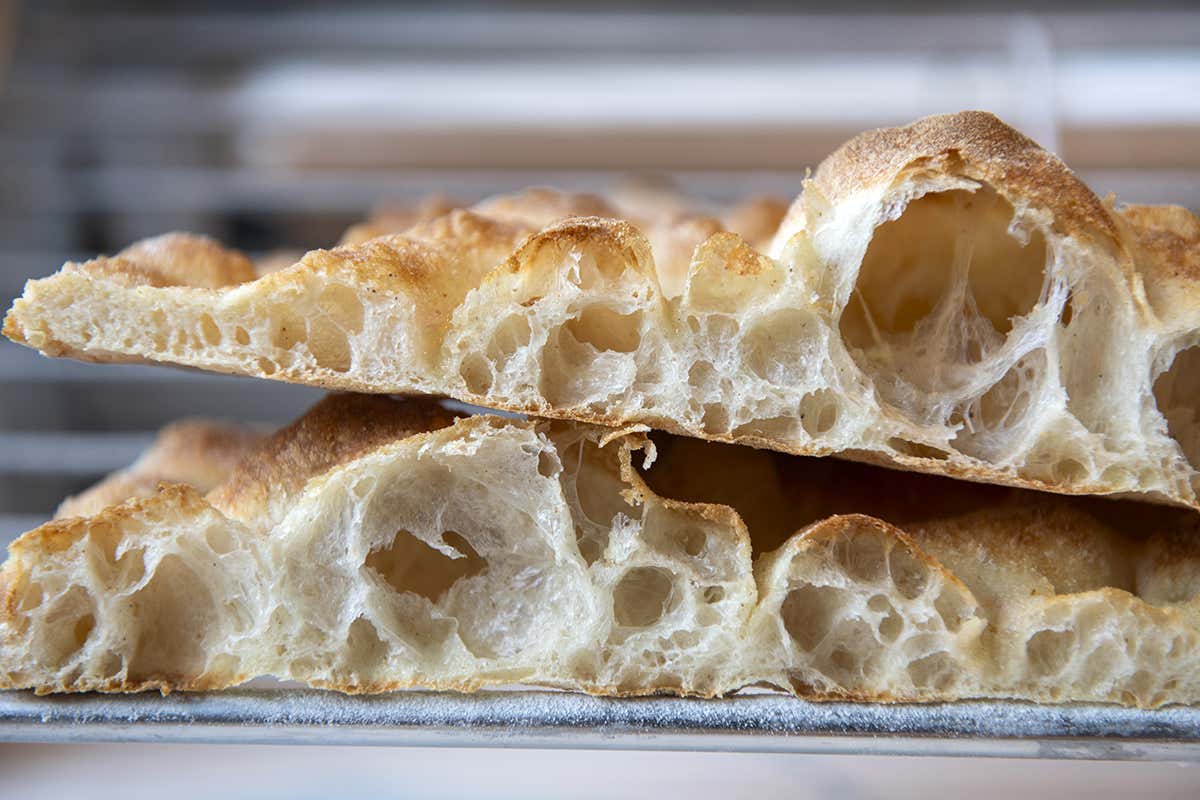 La biga, maturata per 20 ore a temperatura controllata, sviluppa aromi complessi e migliora l’estensibilità dell’impasto finale. Dopo l’unione degli ingredienti e una corretta gestione delle temperature, la pala viene porzionata in grandi formati, ideale per la ristorazione e la condivisione.