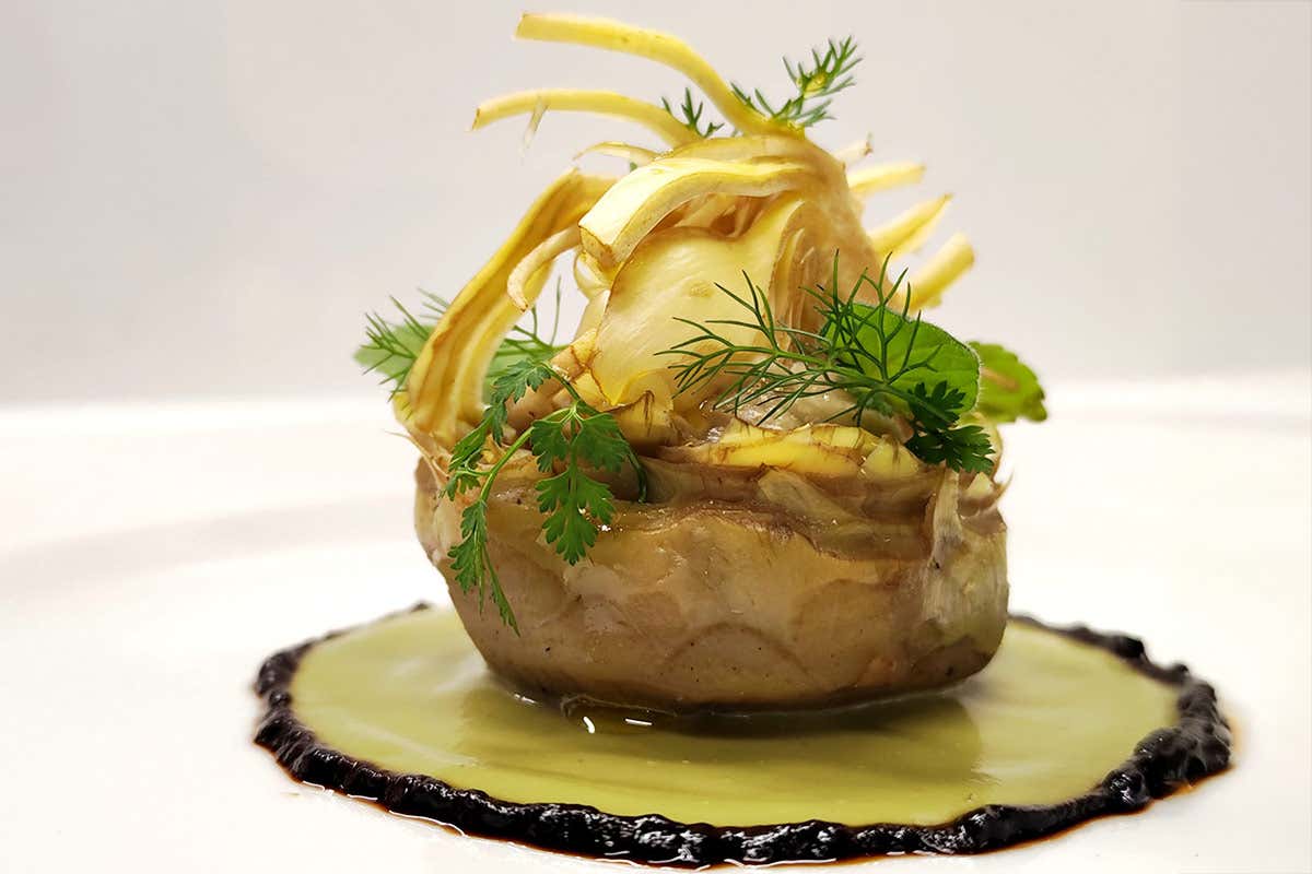 Nei ristoranti della Capitale, il carciofo (che il 13 febbraio celebra la sua Giornata) funziona tantissimo perché tiene insieme identità, memoria e tecnica: dalla giudia alla romana diventa un piatto riconoscibile, rassicurante e trasversale. L’Assoluto di carciofo dello chef Andrea Lattanzi è un piatto concettuale che esplora ogni parte della Mammola romanesca, trasformandola in un percorso di consistenze e temperature. Il carciofo viene scomposto e reinterpretato in più preparazioni: cuore cotto a bassa temperatura, carpaccio crudo, pesto alla Giudia con foglie esterne fritte, salsa alla romana dai gambi e una sorprendente namelaka al cioccolato bianco arricchita con estratto di carciofo.